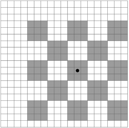 На рисунке (см. английскую версию условия) показан пример поля для \(N = 19\) и \(M = 3\). Клетки, на которых трава была выкошена, отмечены серым. Центр узора имеет координаты \((12, 9)\) и отмечен черной точкой